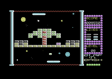 You are an alien, who has been captured and you are now trapped in a space cell. You want to escape, but in order to do this, you need to complete a task. That particular task is to simply blap the ball with your spacebat and clear each intergalactic zone from all of the bricks simply by bashing at them. Aliens will appear and are pretty much helpful. Watch out for the red zone. Should the ball hit a red zone, a shield will be lost. Once all shields are down, a life will be lost. Bonuses will be scored with any remaining shields left after level completion. Collect power ups, and have loads of fun.