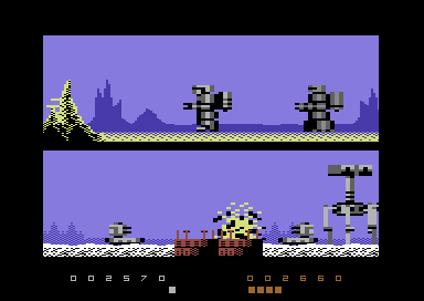 Alf Yngve brings a sequel to Double or Nothing, which takes you further into the future. Now you are battling in two worlds against ferocious enemy forces. This game consists of huge sprites and uses clever concepts. Both players are limited to the ground, and cannot climb or jump. There are plenty of huge robots in which you must fight and destroy – should you wish to progress any further into the game.
