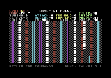 Station64 is a live player (via MIDI). Specifications are: three voices polyphony, oscillator control via MIDI, advanced glide and pitch wheel control and works with 8580/6581 PAL / NTSC. New in this version: Support for hermidi midi interface and particularly soft midi interface. The test tone now has two modes - single note / repeated notes and the arpegiator is now available.