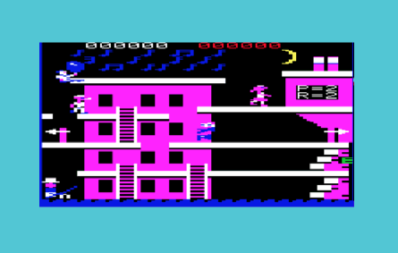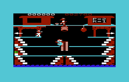 The VIC version seems quite difficult to progress; you need to run about the level quite a bit to collect all the hearts for the first level. Also, Brutus can reach down through the level and grab you. Sometimes the characters seem to merge into the backgrounds -- that gets frustrating.