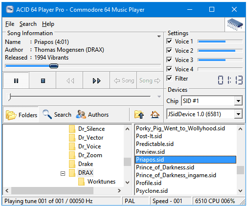ACID 64 player is a cycle based Commodore 64 music player designed for playing SID tunes on sound cards/devices that have a real SID chip (6581/6582/8580) on board like the HardSID PCI cards and the HardSID 4U, Uno, and Uplay USB devices. It also supports network devices that emulate the SID chip like JSidDevice that is part of JSidplay2.