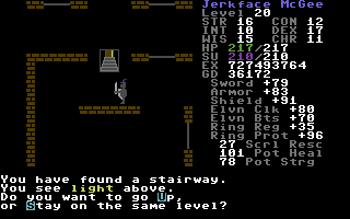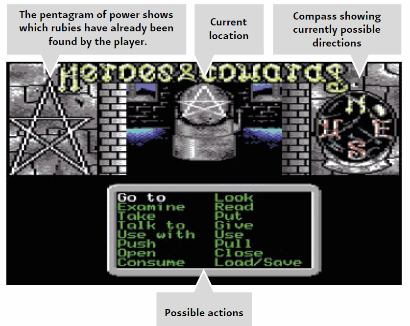 This is a Joystick driven menu system where the user must recover all 5 rubies of power, retiring them to the pentagram of power, this will break the curse of Morlon and return the town folk. You select the verbs and nouns from a provided list, you also use the joystick to move to different locations, each location gives information of the areas you can move into and your status in the game.