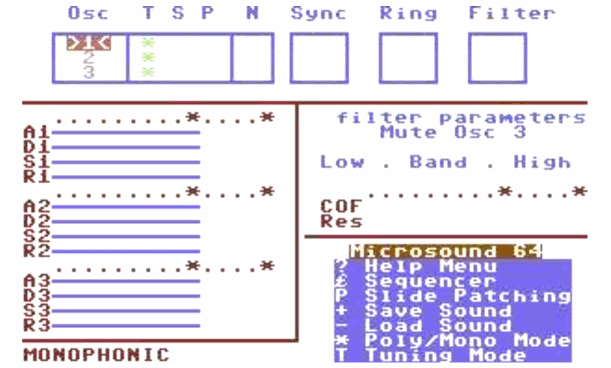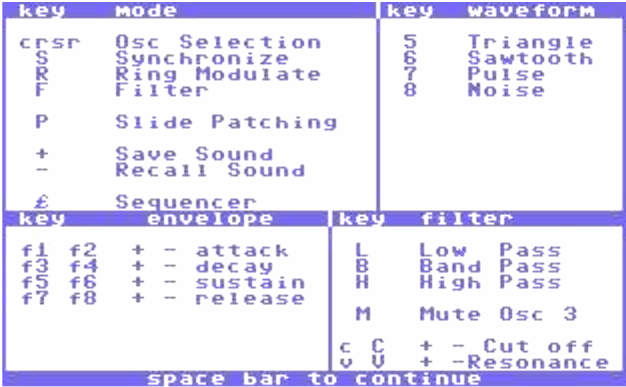 This is the main opening screen after the credits and is a real-time sound manipulation program. Here you can change the characteristics of the sound by manipulating the ADSR (attack Decay Sustain and Release). You can also apply Ring modulation and filter can be set as low, middle, or high. You can also set the keyboard to play mono or three-note polyphony, and the sound can further be tweaked by selecting the wave form Triangle, Sawtooth, pulse and noise. Pressing T lets you fine-tune the sound to mix with other instruments. Pressing P lets you configure the sliders: they can control filter cut off, frequency, pulse width or low frequency oscillator. Once you’re happy your sound preset can be saved for later use.