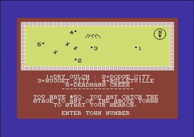 The player (you) have to travel between towns looking for the murderer, its quicker if you can buy a horse, otherwise you will have to walk and that takes twice as long, a horse could also out run villains you meet along the way. But remember to take water and food, oh a saddle will be needed or you cant ride the horse and without food and water you both will die. You will of course need a gun and a knife, what about when it gets cold in the mountains you will need a thick coat and maybe a knife. What if you are attacked by a snake, you will probably need some snakebite location. Of course all this can be purchased before your travels in the store, but do you have enough money and or strength to make the journey. You need to also watch out for the sheriffs agents who are looking to capture you for the murder, where will they be could the telegraph office know the agents whereabouts, will this cost money to find out from the telegraph operator.