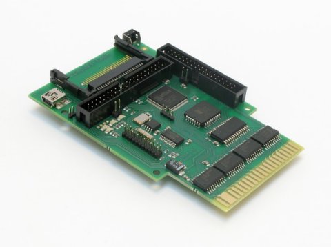 The IDE64 cartridge is a device for connecting an IDE hard disk drive and CD-ROM drive to a C64, and/or it can be used with a Compact Flash card. It is plugged into the Expansion Port and connected to the hard drive by means of a 40-wire cable. IDE hard drive transfer rate is more than 100 times the rate of the floppy drive 1541. The IDE cartridge contains a 128kB ROM (EPROM or flash EPROM with IDE DOS, Machine Code Monitor, File Manager and Setup), a 28kB RAM (used for internal buffers), a real-time clock chip (powered by a battery), two LEDs (to indicate the presence of the cartridge and HDD activity), a Short-BUS for new peripherals, Amiga Clock Port, mini-USB Device Port (PCLink), and an ispLSI chip. Its price is 99 Euros including shipping.