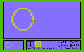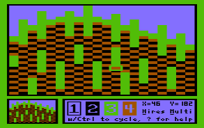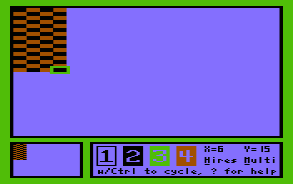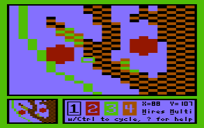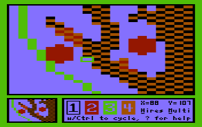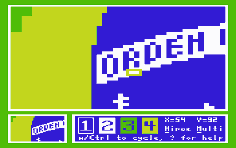 ⇧ Back To ContentsAs a comprehensive manual for MINIPAINT is in the works, a complete coverage of the editing functions is given there. For the following tutorial it suffices to know, that cursor controls work as usual, pixels are set with the keys 1 to 4, their colour assignment is changed with CTRL-1 .. CTRL-4, SPACE toggles between editor, and a full screen preview, and while editing it is always possible to invoke the on-line help system with '?' (SHIFT + /).