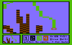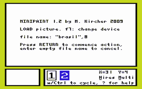 Still, the VIC chip is capable of displaying really stunning pictures when a good graphician has complete control over the finest aspects of the displayed picture. This is, what MINIPAINT is designed for. Of course it can also be used to fix up conversions.