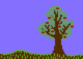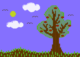 The grass at the bottom is painted in two steps: first put a two-pixel thick line in green between ground, and sky. Then add blades of grass with vertical lines. To draw the apples, change the foreground colour (2) to Red. Place the apples within the treetop. While doing this, some parts of the branches might change colour from Black to Red. This is the colour clashing mentioned in chapter 2. Leave the affected parts alone for the moment.