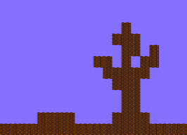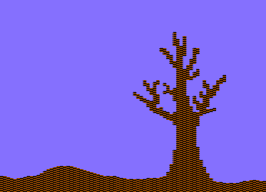 Orange is toned down to Brown for the branches, and trunk of the tree. For this, mix Orange, and Black in the top-left corner of the screen in a chequered pattern, up to X=6 and Y=15 - the whole top-left attribute cell. Cut the cell with the DEL key, and then sketch the bottom ground, and tree with the INST key: