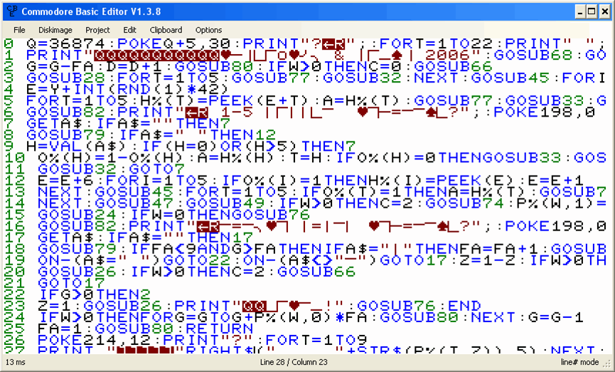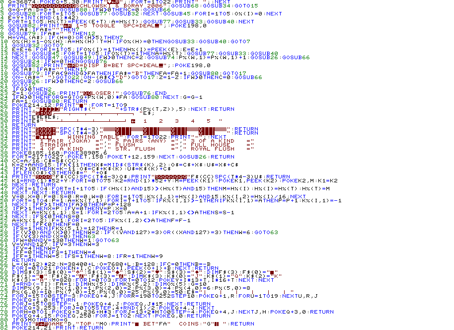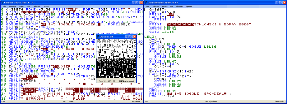 I think that's a common misunderstanding about Basic being slow and ugly and leading to unreadable code etc. Basic itself isn't a bad language, indeed it does a good job with string handling - just trying to be as versatile in self programmed assembler routines as Basic is with strings can be a coding nightmare. Of course it's slow compared to assembler, but taking my above sample of an input loop there is no need to be faster anyway, Basic does the job as good as required! So for me it's always the right tool for the right job, doing the tedious tasks of user input or string handling in Basic and maybe outsourcing some time critical parts to assembler. And doing it on a PC is something along the same lines using the right tool for the right job. If I want to get some retro feeling I code on the real machine, but if I want to concentrate on the source and algorithms I use BasEdit and let the result run in an emulator. When finished and satisfied with the solution in the emulator it's time to test on the real machine as this often; simply feels different; due to screen resolution, keyboard etc. and sometimes the real machine simply behaves differently to emulated one. For example the program Videopoker which is part of the BasEdit distribution as a sample file, was written in BasEdit (the old one). It's for the unexpanded VIC and can be viewed in BasEdit in total within one screen on the PC - on the Vic it's about 10 pages! with basic lines spawning up to 4 screen lines which makes it at least very difficult to edit and understand on the real machine.