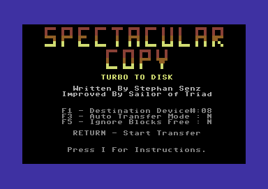 Sailor has released an improved version of the transfer program Spectacular Copy. The originally creator Stephan Senz used to transfer programs from a datassette to a disk drive.