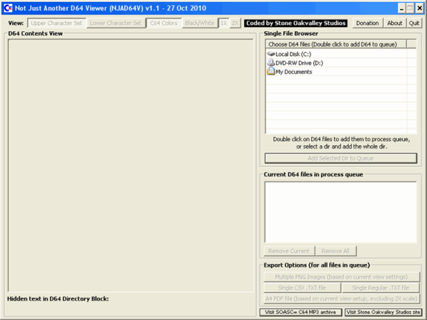 A tool that will display the contents of D64 disks as real C64 graphics using the original chars and colours without having to use any emulator or a real C64. From that point you are able to graphically or textually export the information stored in the directory structure of the D64 disks.