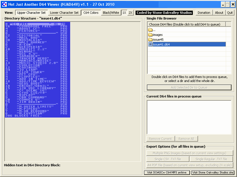 A tool that will display the contents of D64 disks as real Commodore 64 graphics using the original chars and colours without having to use any emulator or a real C64. From that point you are able to graphically or textually export the information stored in the directory structure of the D64 disks.