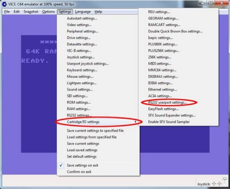 Now you have to tell VICE to enable the RS-232 port. Click on Settings > Cartridge/IO settings > RS-232 Userport settings from the menu, as shown: