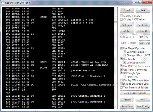 An interactive disassembler for Commodore 64 binaries has been released called “Regenerator” the application will load any standard Commodore 64 .PRG file (or VICE snapshot) and disassemble.