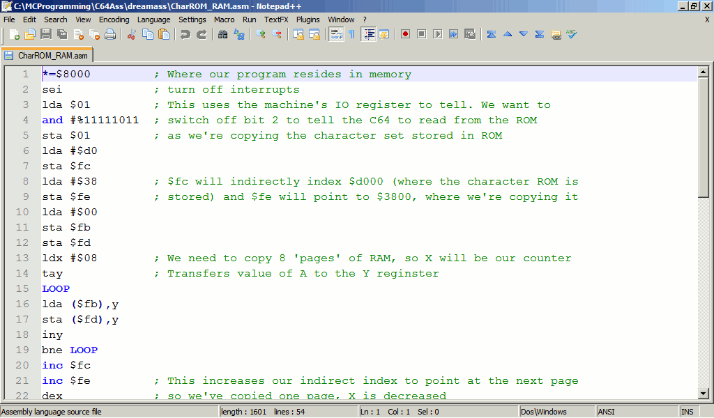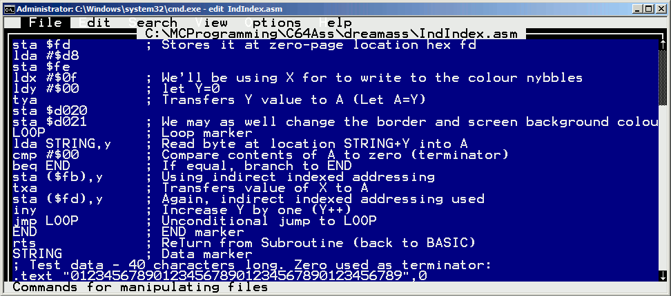; Here's where our program will reside in memory (12*4096) *=$c000 lda #$00 ; Let A=0 sta $fb ; Stores it at zero-page location hex fb lda #$04 ; Let A=4 sta $fc ; Store at hex fc lda #$00 ; And again... sta $fd ; Stores it at zero-page location hex fd lda #$d8 sta $fe ldx #$0f ; We'll be using X for to write to the colour nybbles ldy #$00 ; let Y=0 tya ; Transfers Y value to A (Let A=Y) sta $d020 sta $d021 ; We may as well change the border and screen background colour LOOP ; Loop marker lda STRING,y ; Read byte at location STRING+Y into A cmp #$00 ; Compare contents of A to zero (terminator) beq END ; If equal, branch to END sta ($fb),y ; Using indirect indexed addressing txa ; Transfers value of X to A sta ($fd),y ; Again, indirect indexed addressing used iny ; Increase Y by one (Y++) jmp LOOP ; Unconditional jump to LOOP END ; END marker rts ; ReTurn from Subroutine (back to BASIC) STRING ; Data marker ; Test data - 40 characters long. Zero used as terminator: .text "0123456789012345678901234567890123456789",0