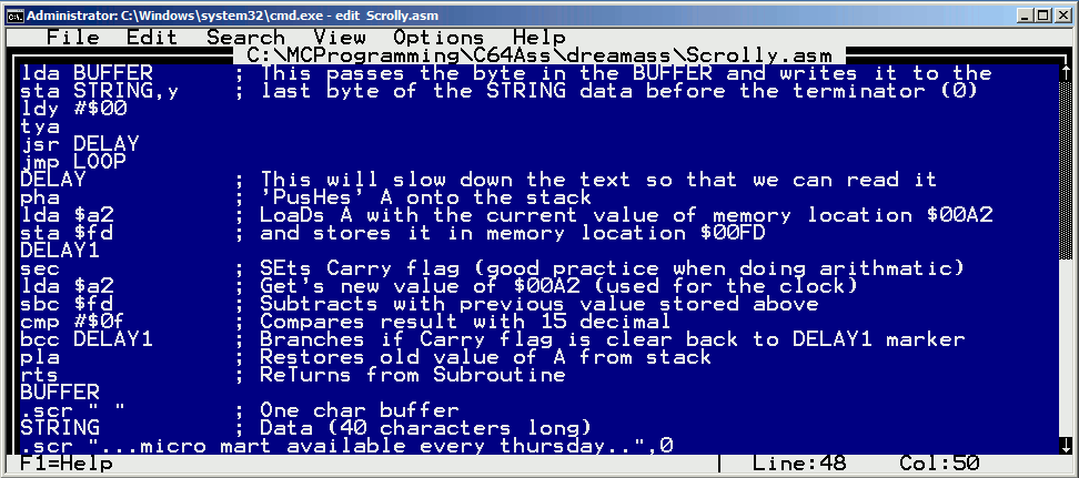 *=$8000 ; Program is stored at 8*4096 lda #$04 ; A=04 sta $fc ; Store A at hex fc lda #$00 ; A=00 sta $fb ; Store A at hex fb (Processor will see it as $0400, or start of screen RAM) sta $d020 sta $d021 tay ; Let Y=A LOOP ; Loop marker lda STRING,y ; Read byte at location STRING+Y into A cmp #$00 beq SHUFFLE ; If equal, branch to SHUFFLE sta ($fb),y ; Using indirect indexed addressing again iny ; Increase Y by one (Y++) jmp LOOP ; Unconditional jump to LOOP SHUFFLE ; This will move each character to the left tay LOOPY lda STRING,y cmp #$00 beq AGAIN sta BUFFER,y ; This takes the character at STRING+Y and stores it at iny ; BUFFER+Y, which is a one-byte off set, then Y=Y+1 jmp LOOPY AGAIN dey ; DEcrease Y by one (Y--) lda BUFFER ; This passes the byte in the BUFFER and writes it to the sta STRING,y ; last byte of the STRING data before the terminator (0) ldy #$00 tya jsr DELAY jmp LOOP DELAY ; This will slow down the text so that we can read it pha ; 'PusHes' A onto the stack lda $a2 ; LoaDs A with the current value of memory location $00a2 sta $fd ; and stores it in memory location $00fd DELAY1 sec ; SEts Carry flag (good practice when doing 6502 arithmetic) lda $a2 ; Gets new value of $00a2 (used for the clock) sbc $fd ; Subtracts with previous value stored above cmp #$0f ; Compares result with 15 decimal bcc DELAY1 ; Branches if Carry flag is clear back to DELAY1 marker pla ; Restores old value of A from stack rts ; ReTurns from Subroutine BUFFER .scr " " ; One char buffer STRING ; Data (40 characters long) .scr "...micro mart available every thursday..",0