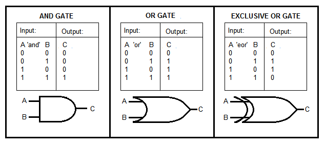 From last week's example, you will have seen in the code the use of simple Boolean logic, using 'or' and 'and' gates. An 'or' gate will return 'true' when one or the other or both are true. As we're dealing with binary, this sets the bit to 1 when one or the other or both are true. For example: