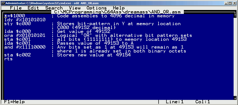 *=$1000 ; Code assembles to 4096 decimal in memory ldy #%10101010 sty $c000 ; Stores bit-pattern in Y at memory location C000 (49152 decimal) lda $c000 ; Get value of 49152 ora #%01010101 ; Logical 'OR' with alternative bit pattern sets sta $c001 ; all bits (11111111) to memory location 49153
