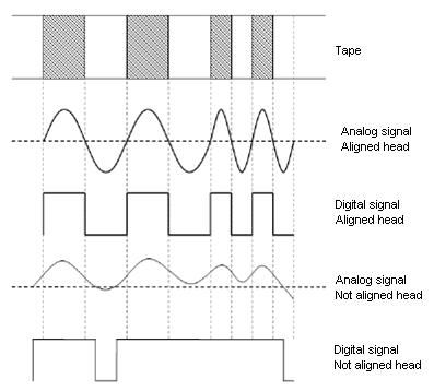 This way of storing data was very dependant of the mechanic factor. The head has to be very well aligned; at least with the same angle as the one that saved the tape, if not, some reading errors could be presented. Figure 4 depicts this situation.