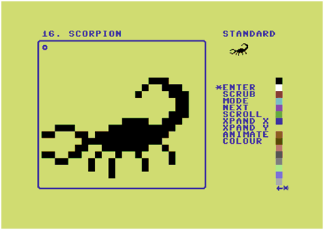 Each sprite is made up of 24 pixels by 21 pixels in mono-colour (high-resolution) mode, with multi-colour mode halving the vertical resolution, meaning 12 by 21 pixels. There is quite versatile handling too, as each [sprite] may be expanded horizontally, vertically or both, and is automatically layered based on a pre-set of zero through to seven. And regardless of how chunky you have set your MOBs, you are still able to move them horizontally or vertically one single pixel at a time based on the default visible area of 320 by 200 pixels, which is quite good as it always ensures smooth movements even if the graphics have that 'blocky' look about them. You may also set the priority of each sprite to say whether or not it is in front of or behind the characters on the screen or the bit-mapped, but you are not able to change the way one sprite may over or under lap another as this is set by the hardware. I have a brief sprite demonstration next time as unfortunately we've ran out of space for a coding example.