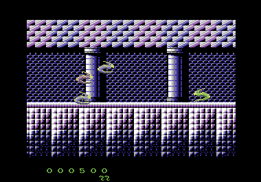 The games backgrounds are very colourful and there is a lot going on screen (background wise at any rate) with the design of the columns etc it’s easy enough to see where you are and what you are supposed to kill or avoid. The main character sprite is dragon like creature in green and the attacking sprites (also dragons) move in the usual predetermined SEUCK patter completing this level is just a matter of moving to the right place on screen and pressing fire, until you get to the end. The enemy movements should have been a little more random but again this is more a SEUCK limitation than a game design, however some of the enemies could have moved differently.