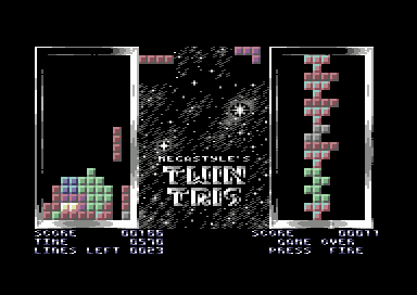 Using a joystick in either port. Move falling the blocks in place to form rows of lines. After each row has been has been eliminated, the ground will shake. You will need to make a certain number of lines to complete a level. Each level is formed of either different brick puzzle layouts or faster falling bricks. Try to complete as many levels as possible. Challenge a friend, and see who comes up trumps with the highest score. Although there is no high score table :)