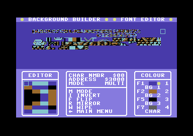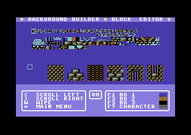 The basic concept of building your own maps consists of designing your very own character set. You design the character set by placing the characters into blocks to build the tiles. Then you place the 4x4 tiles to build a map. Actually getting the game maps in action will require additional programming. Anyway, here are the general editing controls: