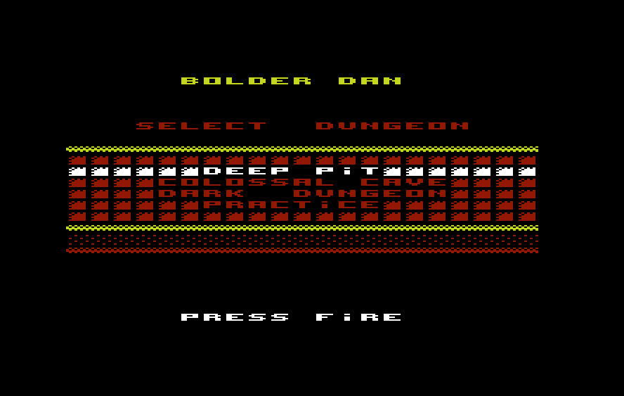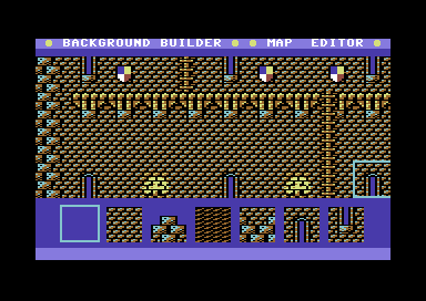 As mentioned before, this version of the game comes with a simple-to-use level editor. The scroll text already gives you the instructions on how to place a tile. The joystick can be used to move the flashing cursor around the grid. Pressing Fire will place a chosen brick into place. Pressing keys A-L will place a selected tile where the cursor lies. Please read the upscroll to find out which tile indicates the object in the game. Using + / - will go forward / backward a level screen. You have 32 screens to design in total.