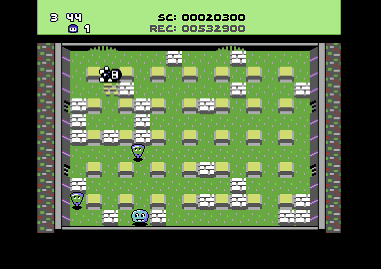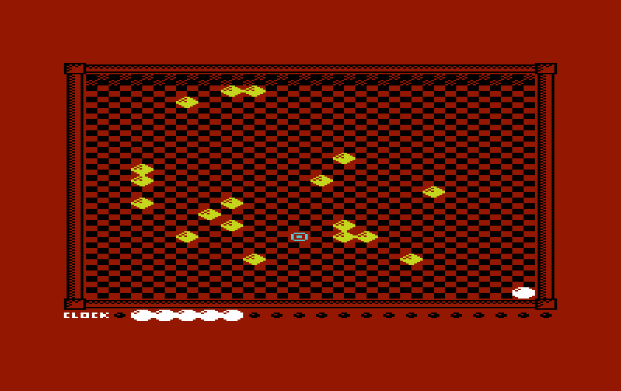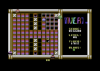 You are a Blob that has been kidnapped by a flying monster and thrown into a cell in Puzzle Land. In an attempt to escape from the cell, you must complete all 32 puzzles inside. All black, inverted tiles in the play area must be INVERTED back to their normal state within the time limit. This may sound simple enough, but you are not alone. Monsters (Chatters) are out to stop you from completing the puzzle. They run around the perimeter of the outer rim of the cell. At times they will feel like throwing bombs. So you must not only restore all inverted tiles, but do so while defending yourself from the Chatters.