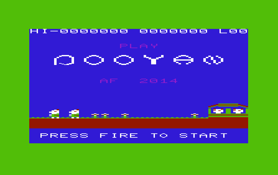 On loading the game, just like the arcade version; the balloons appear float midway up the screen and then pop and for the letters pooyan. To see this screen again you have to die; so you will get used to it! After the main title screen; we are treated to an animation of the pigs being chased by the wolves, this then clears and we start the first stage.