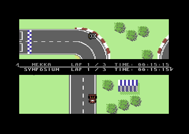 This is a public domain racing game for 2 players only. It was written back in 2001 for the Mekka Symposium party. Both players must enter their names. Select a car and choose the total number of laps to win the game.