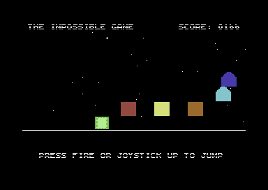 Using just the fire button on your joystick in port 2, help your square jump across the moving maze and jump over any infinite obstacles on the ground as they scroll towards you. You can also jump on to other objects which are raised as platforms. Keep on going until you lose. :) Try to get the best score where possible :)