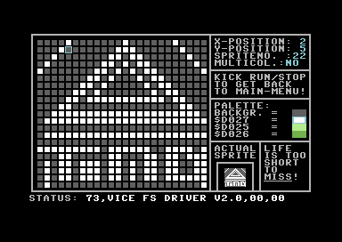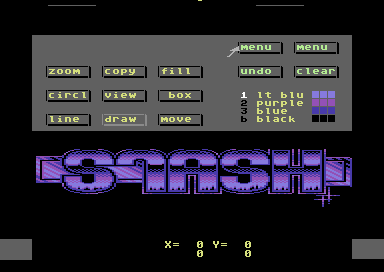 This is a nice utility which allows you to design and create your very own 3 colour logos for your own C64 programs. This editor has a series of different options in which you can select to draw, fill copy and also enjoy some music by Drax/Vibrants in the background. The logo editor also allows you to convert logos painted from Koala paint into char and matrix form – and char and matrix to hires/multi.