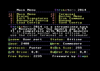 Striketerm 2014 is a streamlined hack of Novaterm for the modern day C-64 It is compatible with Nova9.6 modules