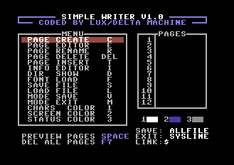 Lux of Delta machine has released a C64 text writer. The download has the D64 and also a text file of how to use the program. In the text file is a plea for help: