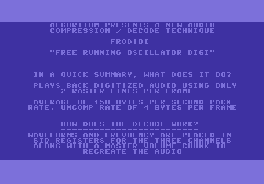 The Algorithm releases FRODIGI (Free Running Oscillator Digi) for the Commodore C64. This is a playback utility for digitized sound. It uses the free-running oscillators SID from the SID chip with 3 channels and the volume setting to display the audio. The program can store 4 minutes audio in less than 41 Kbyte