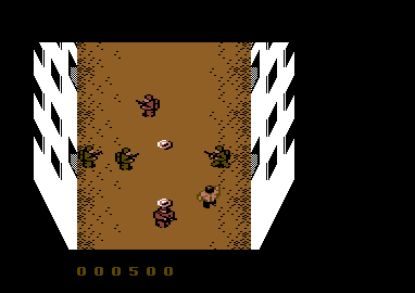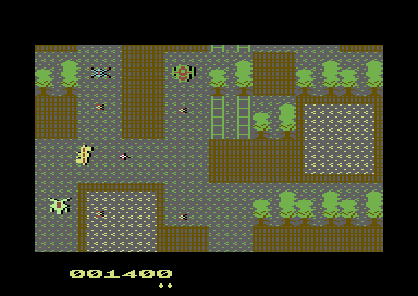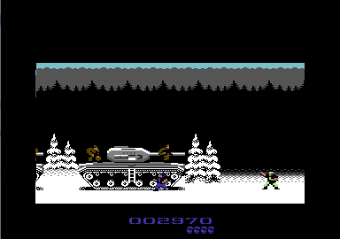 Interesting choice of music; not sure it fits with the game, although the drum beating (I suppose) adds to the Army feel in this game, but again another credible tune, superb loading screen, although it looks uncannily like a real president from America. You fight the enemies in this top down scroller moving over various terrains; watch out for the mental solders in red dropping land mines (ouch)
