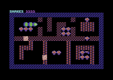 Hands up – who remembers the worm/nibbly games? Well, Snake Bite is something quite different. One way or another (as a treat for worm fans), here's something a little different: 'Snake Bite'. Using a joystick plugged into port 2, you must guide your snake around the maze, eating fruit to make your snake group. Then flee to the exit, which will appear after the fruit has been eaten.