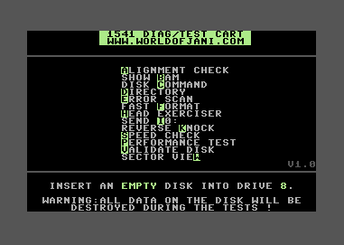 Testing drives means you have to load the test or a diagnostic software from disk. If the drive being tested is faulty you may not be able to load the test or diagnostic program, the cartridge also has a number of tools for testing. All fit into an 8K cart. He comments, “Some tools are old, others were written from scratch, and a few I rewrote in machine code instead of basic.”