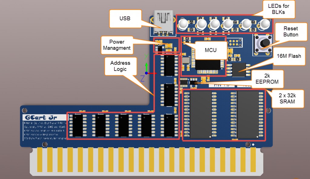 Thomas Lövskog has been working on a number of cartridges for the Commodore VIC - 20. The GCart Junior is a RAM expansion featuring RAM expansion for Block 1, 2, 3 & 5 and RAM 1, 2 & 3. Memory enable, disable and write protect. RAM on IO and IO # 2 # 3. 16 MB Flash with super fast charger and a 3D printed case.